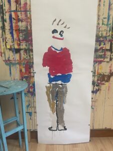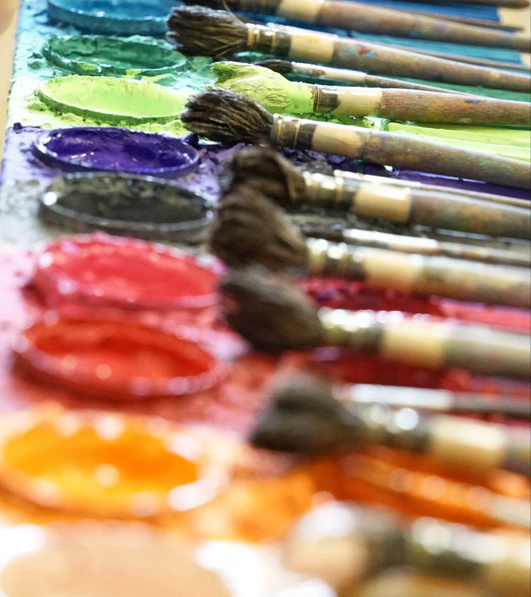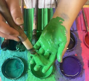 Im Malatelier steht den Kindern eine ansprechende, große Palette mit vielen, verschiedenen Gouache-Farben zur Verfügung. Gemalt wird mit Pinseln auf großformatigem Papier an der Wand im Stehen.